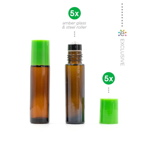 Contents: 5 x 10ml amber bottles with fern (green) cap and premium stainless steel rollerballs