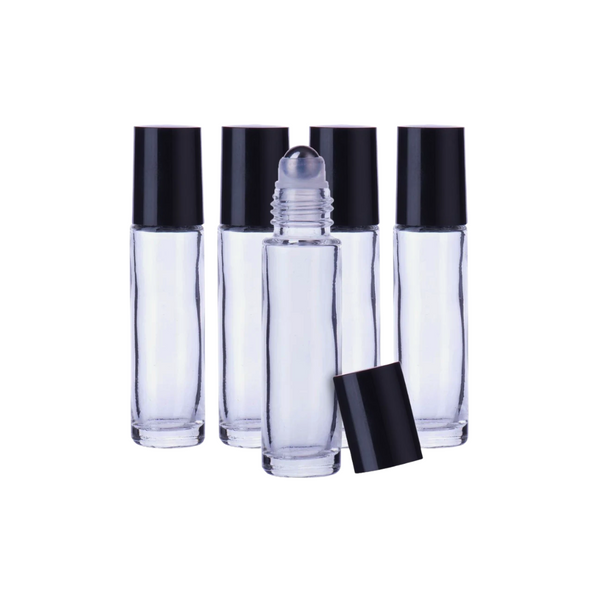 Contents: 5 x 10ml Clear Glass bottles with black lids and stainless steel rollerballs