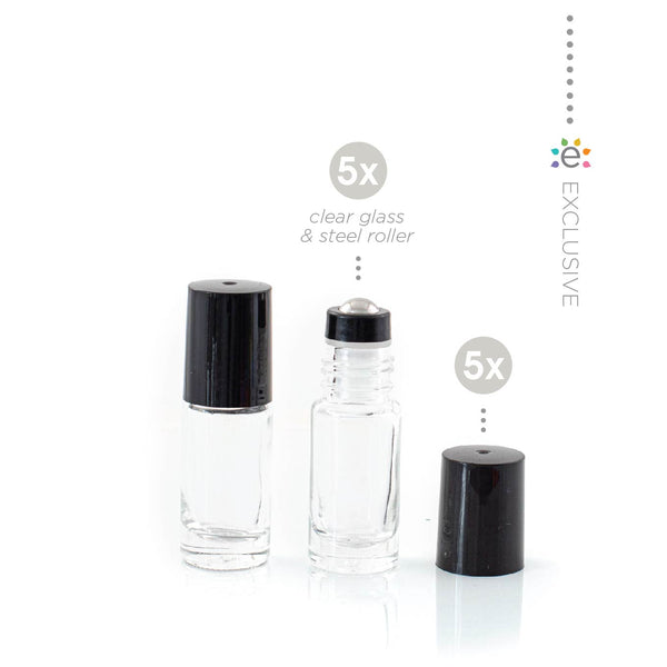 Contents: 5 x 5ml Clear Glass Roller bottles with Black lids and Stainless Steel Rollerballs