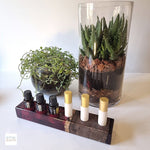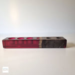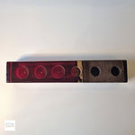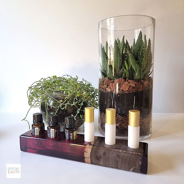 This beautiful handmade Leadwood and resin stand holds three 10ml roller bottles and three 15ml essential oil bottles.
