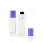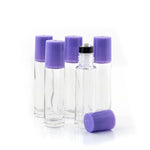 Contents: 5 x 10ml clear bottles with amethyst (purple) cap and premium stainless steel rollerballs