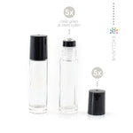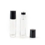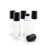 Contents: 5 x 10ml Clear Glass bottles with black lids and stainless steel rollerballs