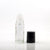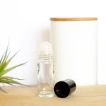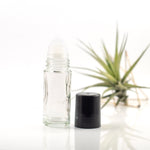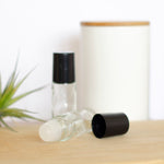 Contents: 2 clear glass bottles with roller ball inserts and black caps.