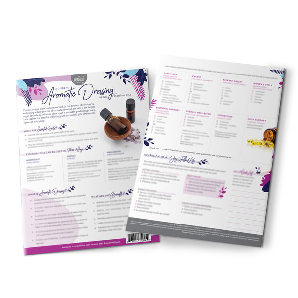 Created with Vanessa Jean Boscarello Ovens, the Aromatic Dressing 4-page educational brochure, part of the Essential Knowledge Series, supports you with the act of self-love by highlighting the benefits of using essential oils and encouraging a daily practice of aromatic dressing that makes your skin look and feel healthy.