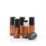 Contents: 5 x 5ml Amber Glass Roller bottles with Black lids and Stainless Steel Rollerballs