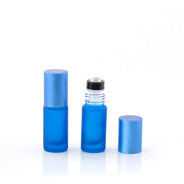 Contents: Set of 5 Frosted Glass Roller Bottles, Premium Stainless Steel Rollers and Metallic Caps.