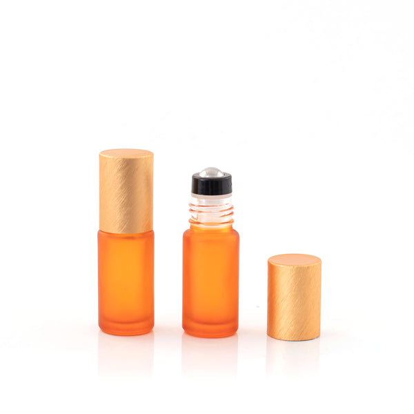 Contents: Set of 5 Frosted Glass Roller Bottles, Premium Stainless Steel Rollers and Metallic Caps.