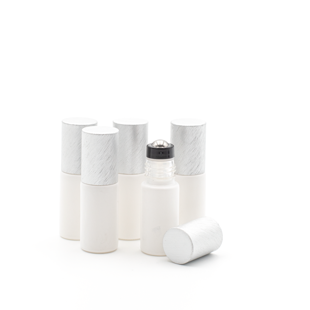 Deluxe Matte 5ml White Roller Bottle with Pewter Metallic Cap & Premium Roller (5 Pack)